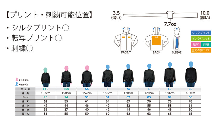 7.7オンス ドライスウェットジップパーカーのサイズ表