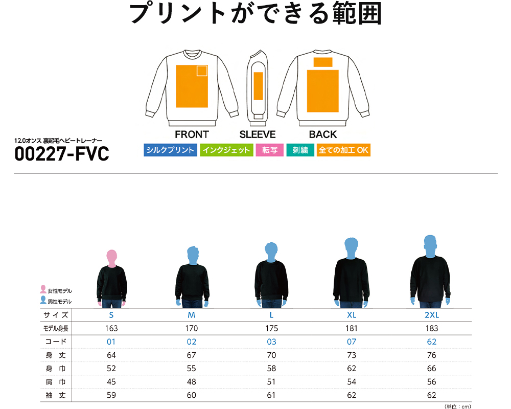 12.0オンス 裏起毛ヘビートレーナーのサイズ表