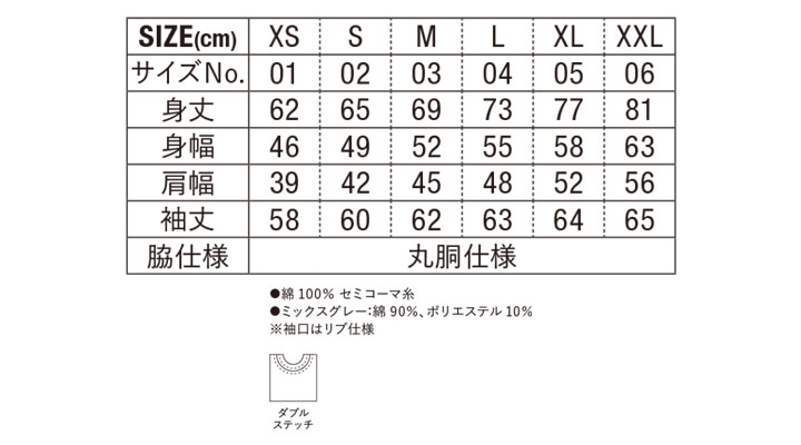 ●機能:首リブ、袖口リブ、ダブルステッチ、丸胴仕様