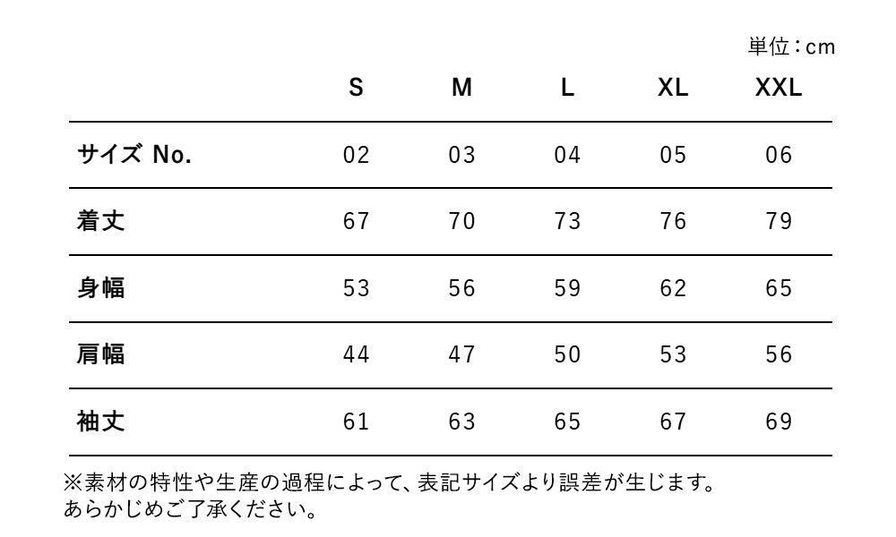 T/C コーチ ジャケット(裏地付)のサイズ表