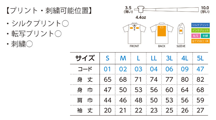 4.4オンス ドライ ボタンダウンポロシャツのサイズ表