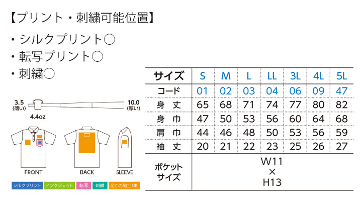4.4oz ドライレイヤードボタンダウンポロシャツのサイズ表