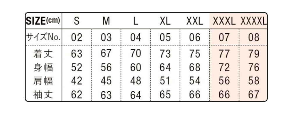 マイクロリップストップ スタッフ ジャケット(一重)のサイズ表
